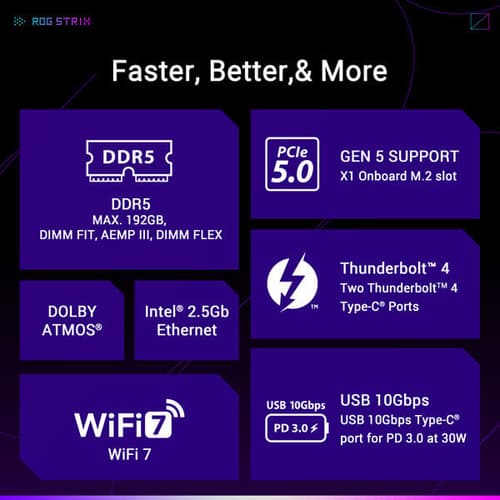 Wireless & Bluetooth | Wi-Fi 7* 2x2 Wi-Fi 7 (802.11be) Supports 2.4/5/6GHz frequency band** Supports Wi-Fi 7 320MHz bandwidth, up to 5.8Gbps transfer rate. Bluetooth® v5.4*** *Wi-Fi features may vary depending on the operating system For Windows 11, Wi-Fi 7 will require 24H2 or later version for full functions, Windows 11 21H2/22H2/23H2 only supports Wi-Fi 6E. For Windows 10, only Wi-Fi 6 is supported. ** Wi-Fi 6GHz frequency band and bandwidth regulatory may vary between countries. *** The Bluetooth® version may vary, please refer to the Wi-Fi module manufacturer's website for the latest specifications. |
