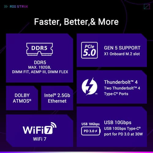 Memory | 4 x DIMM slots, max. 192GB, DDR5 Support up to 8600+MT/s (OC), Non-ECC, Clocked Unbuffered DIMM (CUDIMM)* Dual Channel Memory Architecture Supports Intel® Extreme Memory Profile (XMP) memory module Supports DIMM Flex DIMM Fit ASUS Enhanced Memory Profile III (AEMP III) |